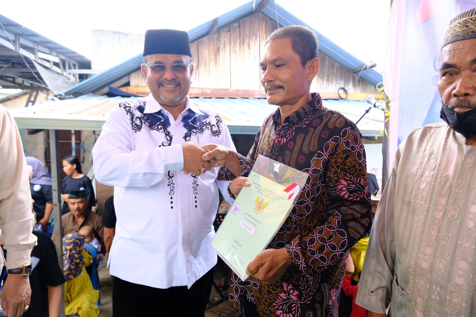 Bupati Karimun Aunur Rafiq menyerahkan 114 sertipikat tanah kepada masyarakat di Gang Perdamaian, Kelurahan Sei Lakam Barat, Kecamatan Karimun, Kabupaten Karimun, Kepulauan Riau pada, Jumat (3/2/2023).