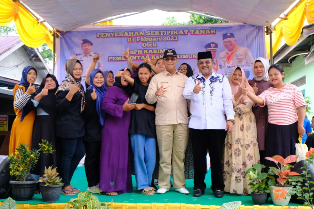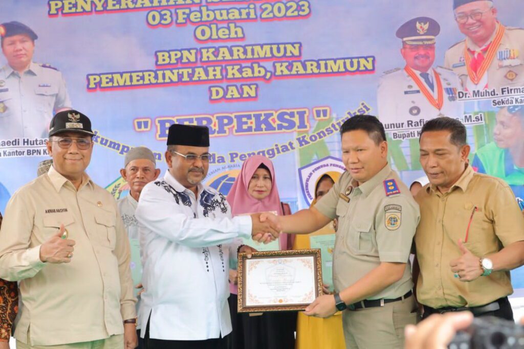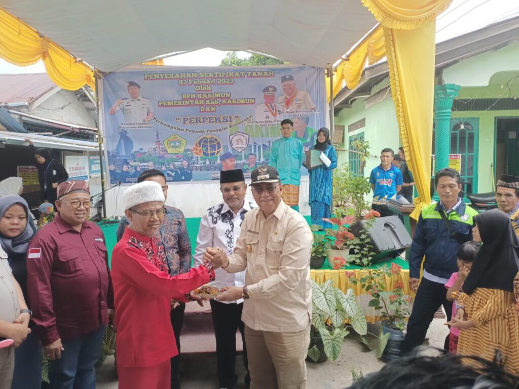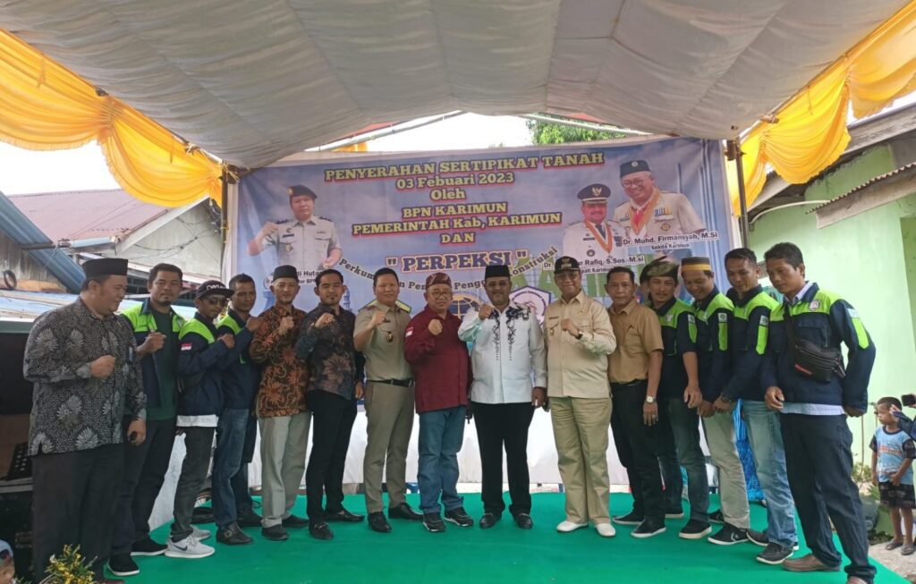 Kegiatan penyerahan sertipikat tanah ini tampak dihadiri juga oleh Wakil Bupati Karimun Anwar Hasyim, Sekretaris Daerah Karimun Muhammad Firmansyah, Ketua Komisi I DPRD Karimun Sulfanow Putra, Kepala BPN Karimun Junaedi S Hutasoit, dan Ketua Organisasi Perpeksi Karimun Muhd Effendi.