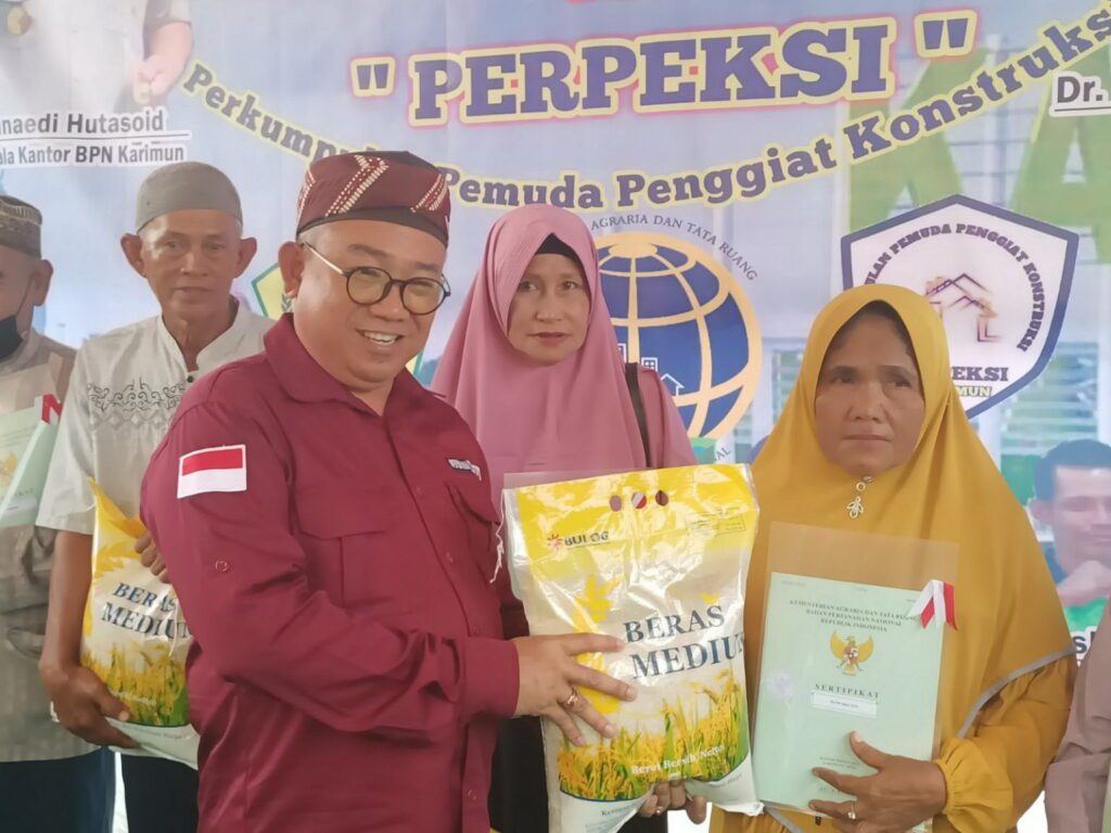 Selain sertipikat tanah, warga juga menerima bantuan beras yang diserahkan langsung oleh Sekretaris Daerah Kabupaten Karimun, Muhammad Firmansyah.