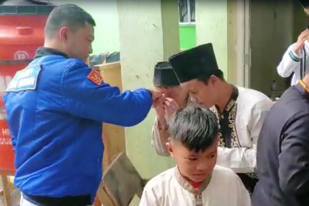 Ketua DPD KNPI Kabupaten Karimun, Raden Richky Dwi Muhardi yang langsung mengantarkan dan memikul sejumlah karung berisikan beras, bagi seluruh pondok pesantren.