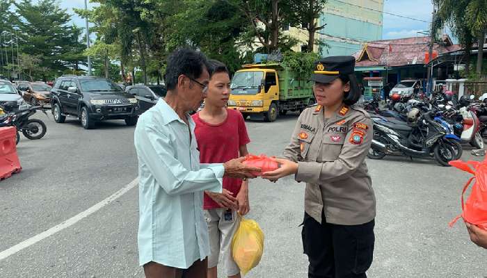Selain personil, Wakapolsek Balai, AKP Kumala Enggar Anjarani turut serta membagikan nasi bungkus ke masyarakat. (yud)