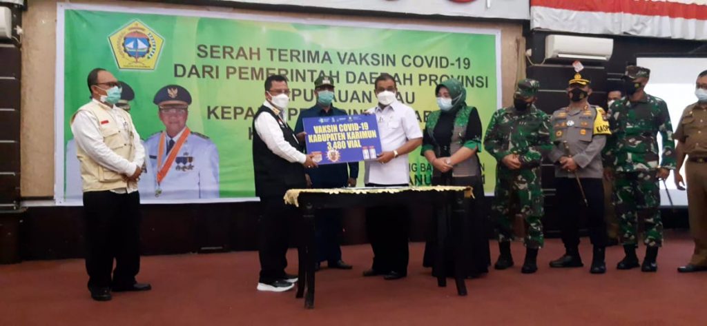 Ribuan vial vaksin itu dikirim melalui Pemerintah Provinsi Kepri yang langsung diserahkan Sekretaris Daerah Provinsi (Sekdaprov) Kepulauan Riau TS Arif Fadillah kepada Bupati Karimun Aunur Rafiq di Gedung Nasional Karimun, Selasa (26/1/2021).