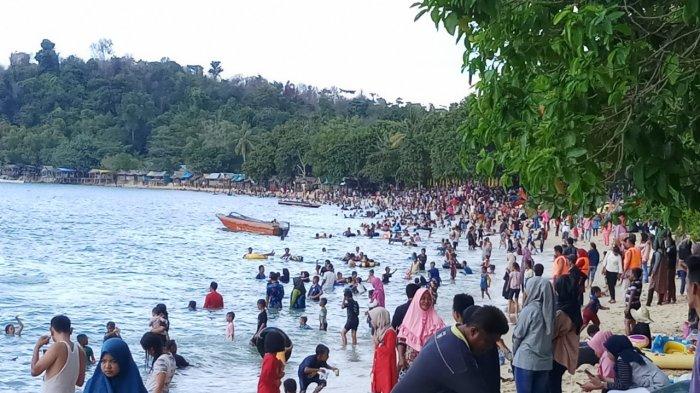 Dari pantauan Lendoot.com, Minggu (8/5/2022), seribuan wisatawan memadati area Pantai Pelawan. Ada yang berenang di laut, bermain di pasir putih ataupun sekedar duduk-duduk di pondok tepi pantai.